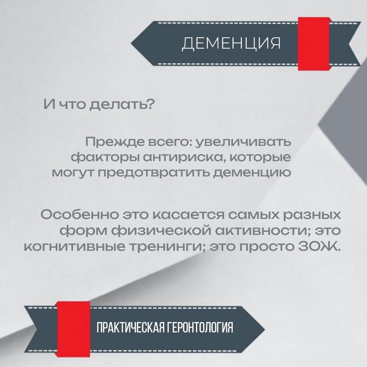 И что делать? Прежде всего, увеличивать факторы антириска, которые могут предотвращать деменцию. Особенно это касается разных форм физической активности; это когнитивные тренинги; это просто ЗОЖ.