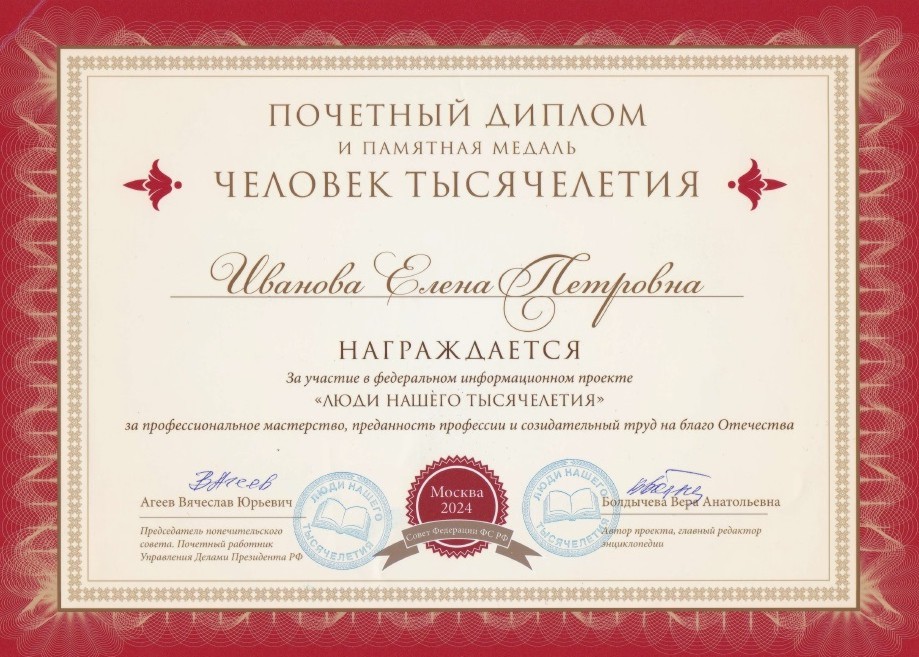 В разделе представлены Дипломы, Сертификаты, Награды за Проекты, разработанные и внедренные непосредственно генеральным директором "Школы практического имиджа "Ванесса" - Ивановой Еленой Петровной, а также Свидетельства необходимых компетенций.