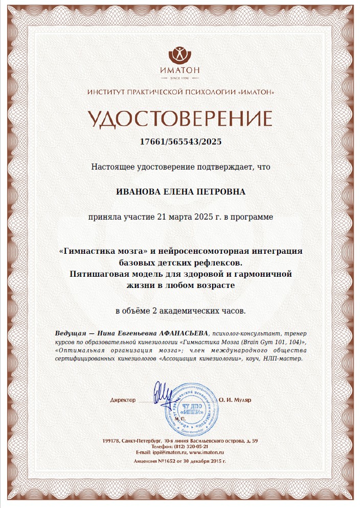 ** практики геронтопсихологии / Институт практической психологии "Иматон"/: "Майнд-фитнес как технология развития когнитивных способностей в любом возрасте", "Гимнастика мозга: 7 ключей к развитию нейрофизиологических факторов эффективности обучения в любом возрасте", "Гимнастика мозга" и нейросенсомоторная интеграция базовых детских рефлексов. Пятишаговая модель для здоровой и гармоничной жизни в любом возрасте", "Кинезиогимнастика лица", "Практики КПТ в работе с людьми пожилого возраста", 48 уч. час.