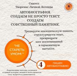 Практика "Пишем Автобиографию" является частью Проекта "Не Стареть Умом", созданного как единый путь, как маршрут к себе самому настоящему, как выстроенная система, где каждая практика усиливает другую, оказывая общее воздействие на все функции человека: когнитивные, физические, эмоциональные и духовные.