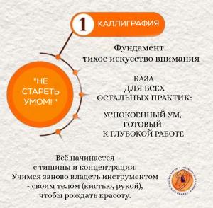 Практика "Каллиграфия" является частью Проекта "Не Стареть Умом", созданного как единый путь, как маршрут к себе самому настоящему. как выстроенная система, где каждая практика усиливает другую, оказывая общее воздействие на все функции человека: когнитивные, физические, эмоциональные и духовные.