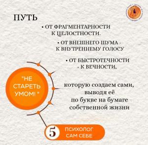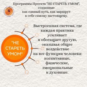 Практика "Психолог Сам Себе" является частью Проекта "Не Стареть Умом", созданного как единый путь, как маршрут к себе самому настоящему, как выстроенная система, где каждая практика усиливает другую, оказывая общее воздействие на все функции человека: когнитивные, физические, эмоциональные и духовные.